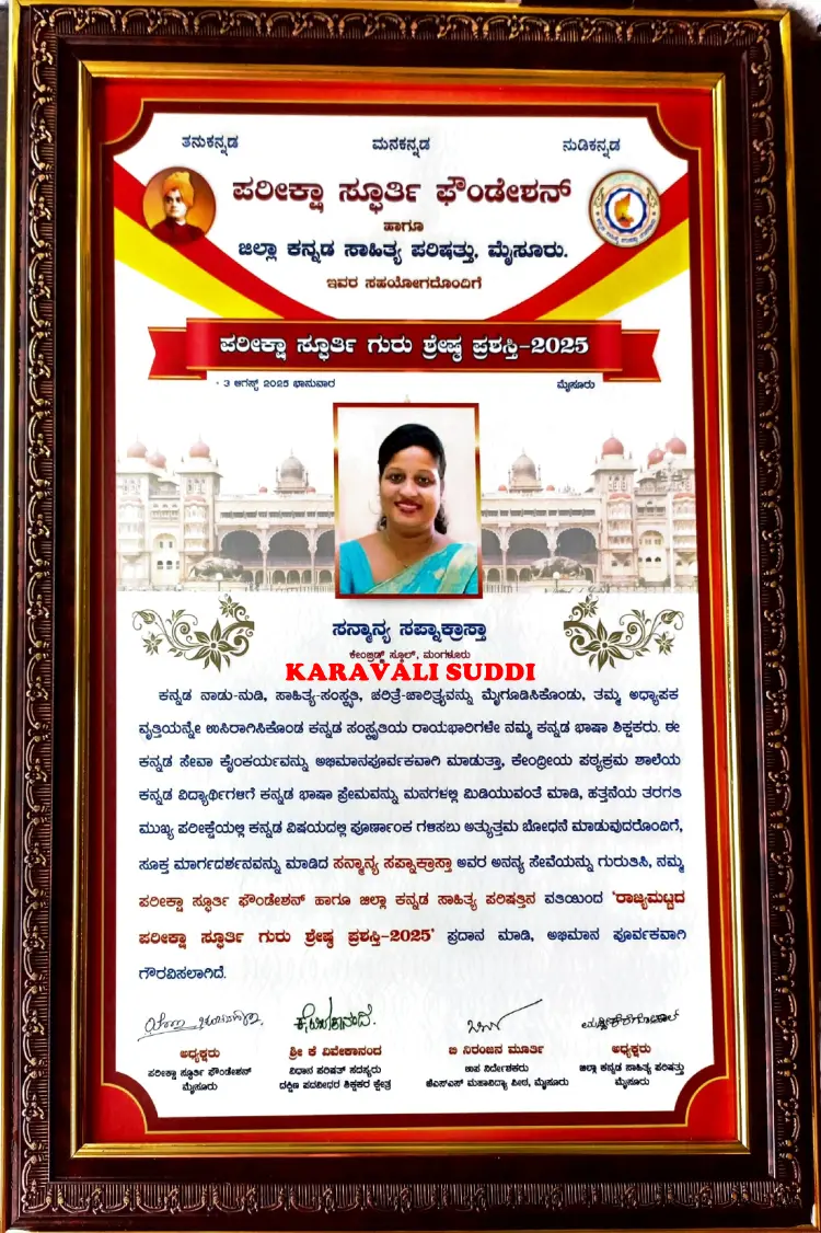ಮಂಗಳೂರು ಪಾಲ್ದಾನೆ ಕೇಂಬ್ರಿಡ್ಜ್ ಶಾಲೆಯ ಕನ್ನಡ ಶಿಕ್ಷಕಿ ಸಪ್ನಾ ಕ್ರಾಸ್ತಾರವರಿಗೆ ಪರೀಕ್ಷಾ ಸ್ಪೂರ್ತಿ ಫೌಂಡೇಶನ್ ಹಾಗೂ ಮೈಸೂರು ಜಿಲ್ಲಾ ಕನ್ನಡ ಸಾಹಿತ್ಯ ಪರಿಷತ್ತಿನ ಸಹಯೋಗದಲ್ಲಿ 2025ನೇ ಸಾಲಿನ ಪರೀಕ್ಷಾ ಸ್ಫೂರ್ತಿ ಗುರು ಶ್ರೇಷ್ಠ ಪ್ರಶಸ್ತಿ ಪ್ರದಾನ ಮಾಡಲಾಗಿದೆ.