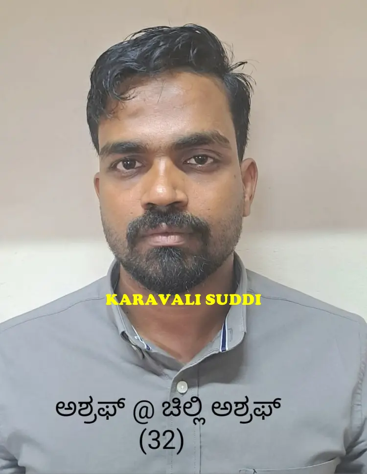 ವಿಟ್ಲ ಪೊಲೀಸ್ ಠಾಣೆಯಲ್ಲಿ ದಾಖಲಾಗಿದ್ದ ಎರಡು ಗಂಭೀರ ಪ್ರಕರಣಗಳ ಆರೋಪಿ ಮಂಜೇಶ್ವರ ತಾಲೂಕಿನ ಕೂಳೂರು ಗ್ರಾಮದ 32 ವರ್ಷ ಪ್ರಾಯದ ಅಶ್ರಫ್ @ ಚಿಲ್ಲಿ ಅಶ್ರಫ್ ಎಂಬಾತನನ್ನು ಸೆಪ್ಟೆಂಬರ್ 21ರಂದು ಭಾನುವಾರ ಕೂಳೂರು, ಮಂಜೇಶ್ವರದಲ್ಲಿ ಪೊಲೀಸರು ದಸ್ತಗಿರಿ ಮಾಡಿ ಮಾನ್ಯ ನ್ಯಾಯಾಲಯಕ್ಕೆ ಹಾಜರುಪಡಿಸಿದ್ದಾರೆ.