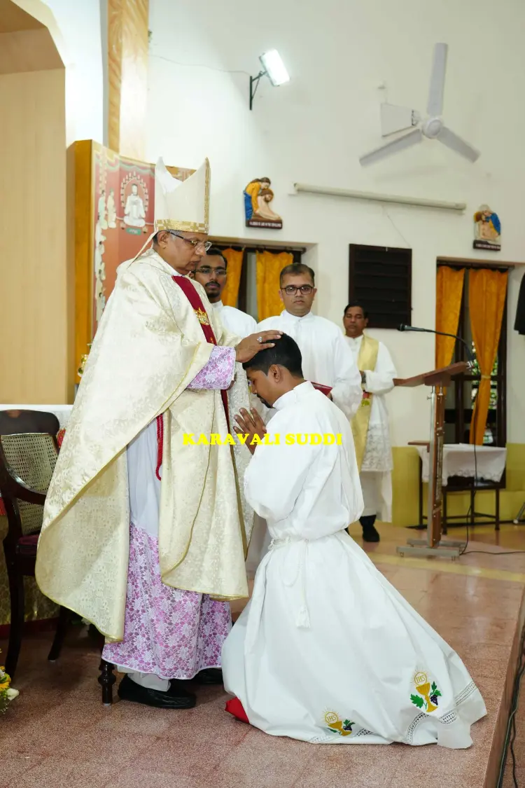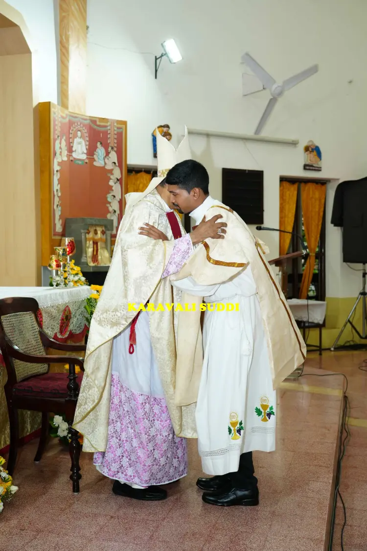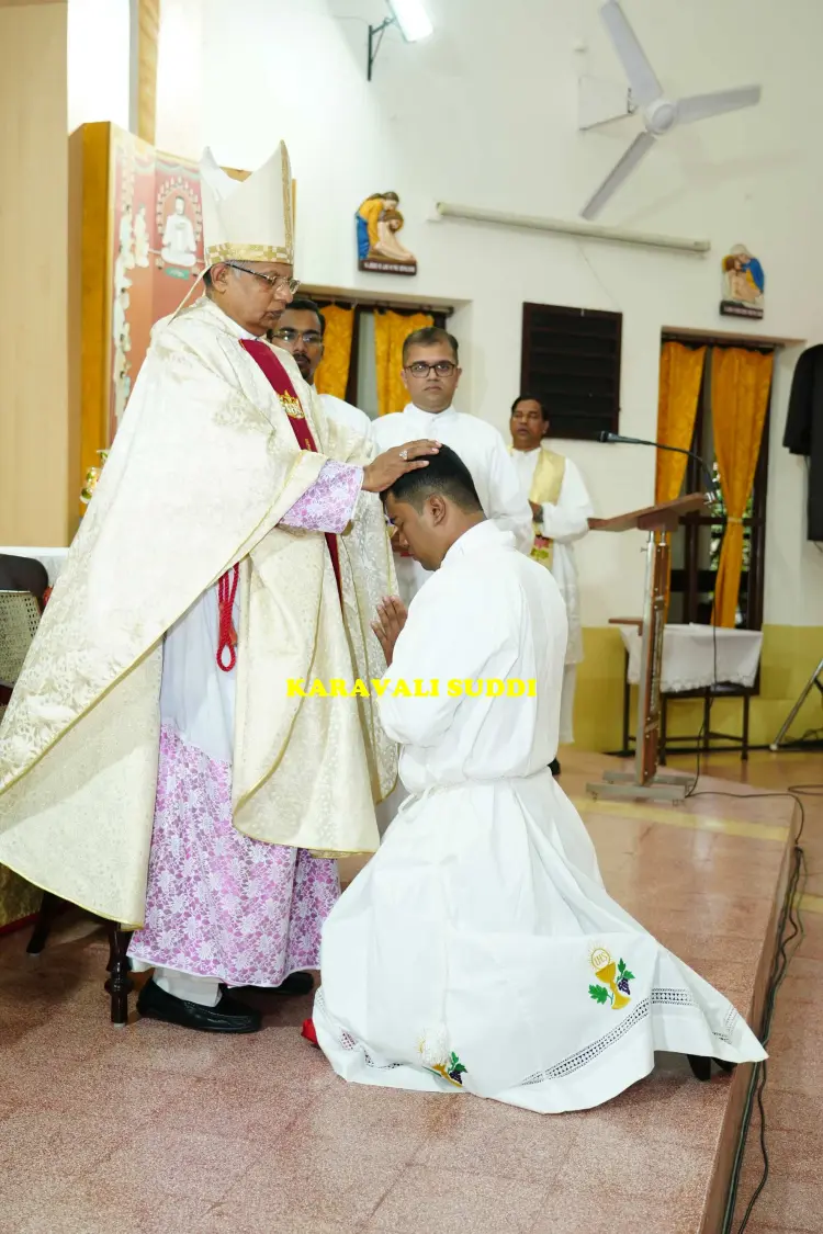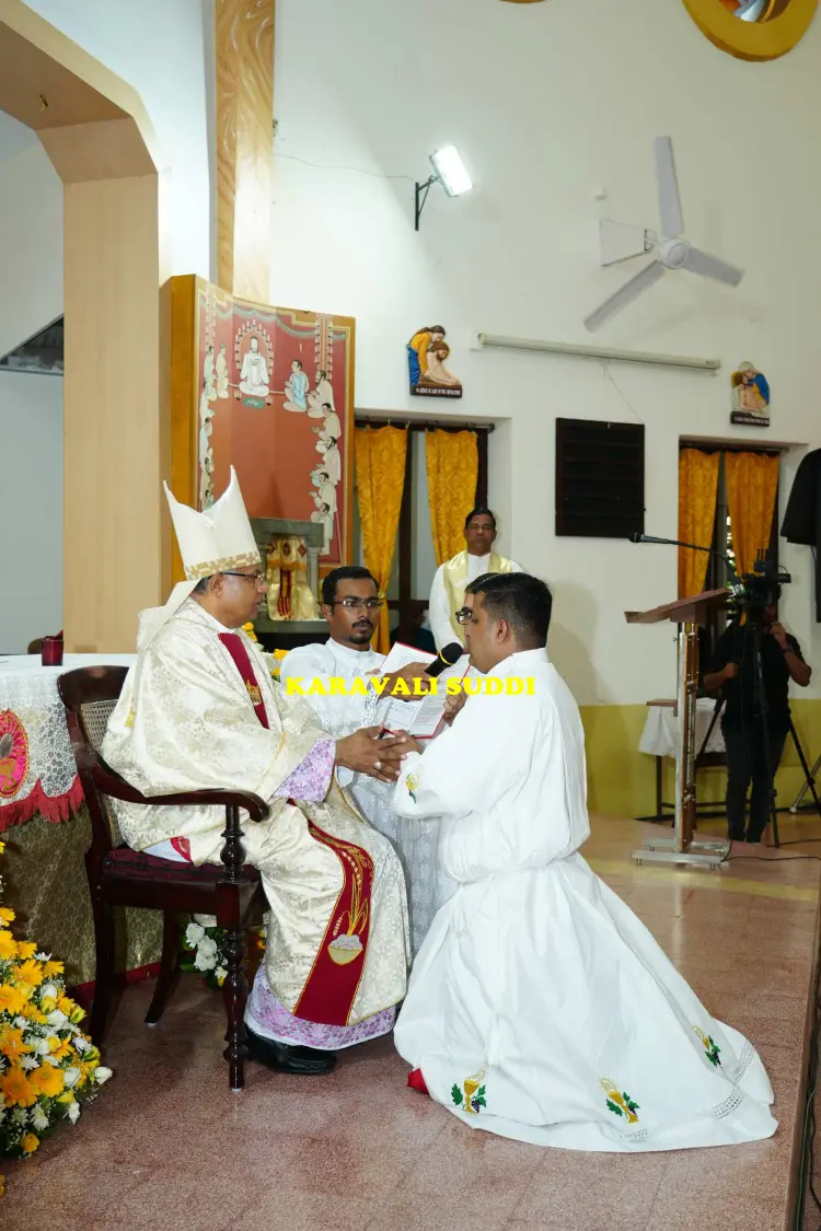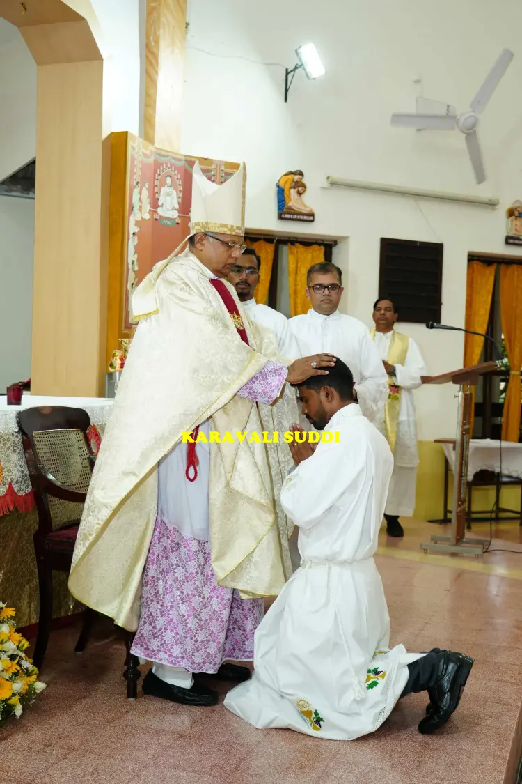 The Liturgy of Ordination, which included the Prostration, the Laying on of Hands and the Solemn Prayer of Ordination, was marked by deep reverence and devotion. The ceremony was animated by Rev. Fr Rohit Dcosta, Director of Mangala Jyothi. A large number of priests concelebrated the Mass, including Msgr.  Maxim L. Noronha, Vicar General; Rev. Dr.Rajesh Rosario, Rector of Saint Joseph Seminary and Rev. Fr Santhosh Rodrigues, Director of the Pastoral Centre, along with the seminary staff.