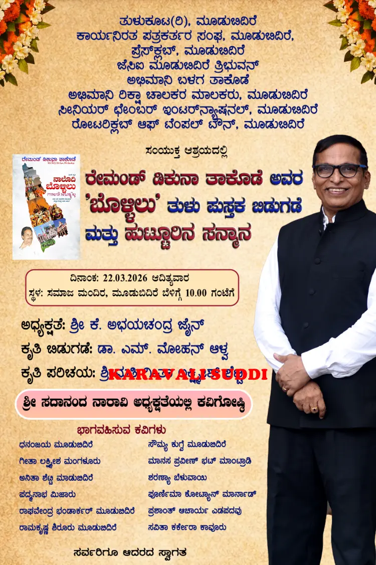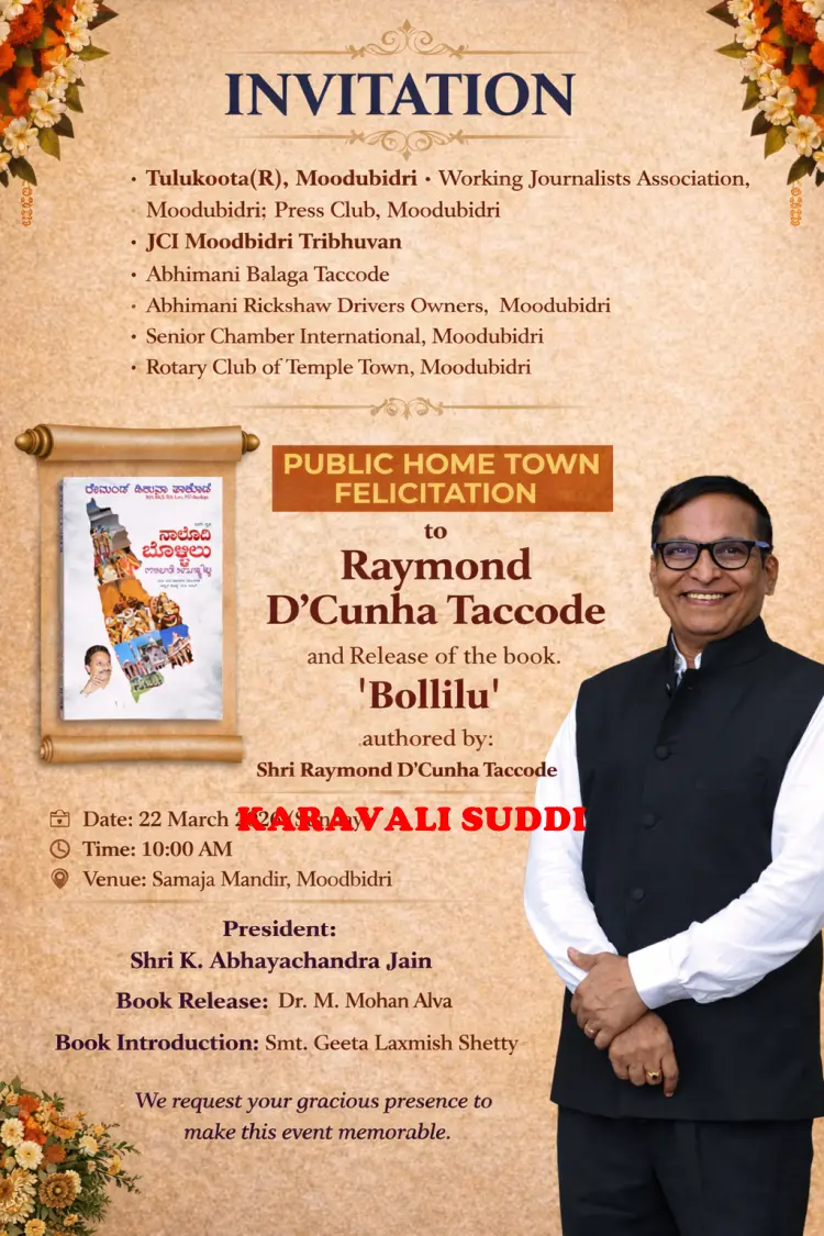 ಕರಾವಳಿಯ ಖ್ಯಾತ ಸಾಹಿತ್ಯ ಪ್ರೇಮಿ ಹಾಗೂ ಸಂಘಟಕರಾದ ರೇಮಂಡ್ ಡಿಕುನಾ ತಾಕೊಡೆ ಅವರಿಗೆ ತಮ್ಮ ಹುಟ್ಟೂರಿನಲ್ಲಿ ಅಭಿನಂದನಾ ಸನ್ಮಾನ ಹಾಗೂ ಅವರು ತುಳು ಲಿಪಿಯಲ್ಲಿ ರಚಿಸಿರುವ ‘ನಾಲೋದಿ ಬೊಳ್ಳಿಲು’ ಪುಸ್ತಕ ಬಿಡುಗಡೆ ಸಮಾರಂಭವು ಮಾರ್ಚ್ 22ರ ಭಾನುವಾರ ಅದ್ಧೂರಿಯಾಗಿ ಜರುಗಲಿದೆ.