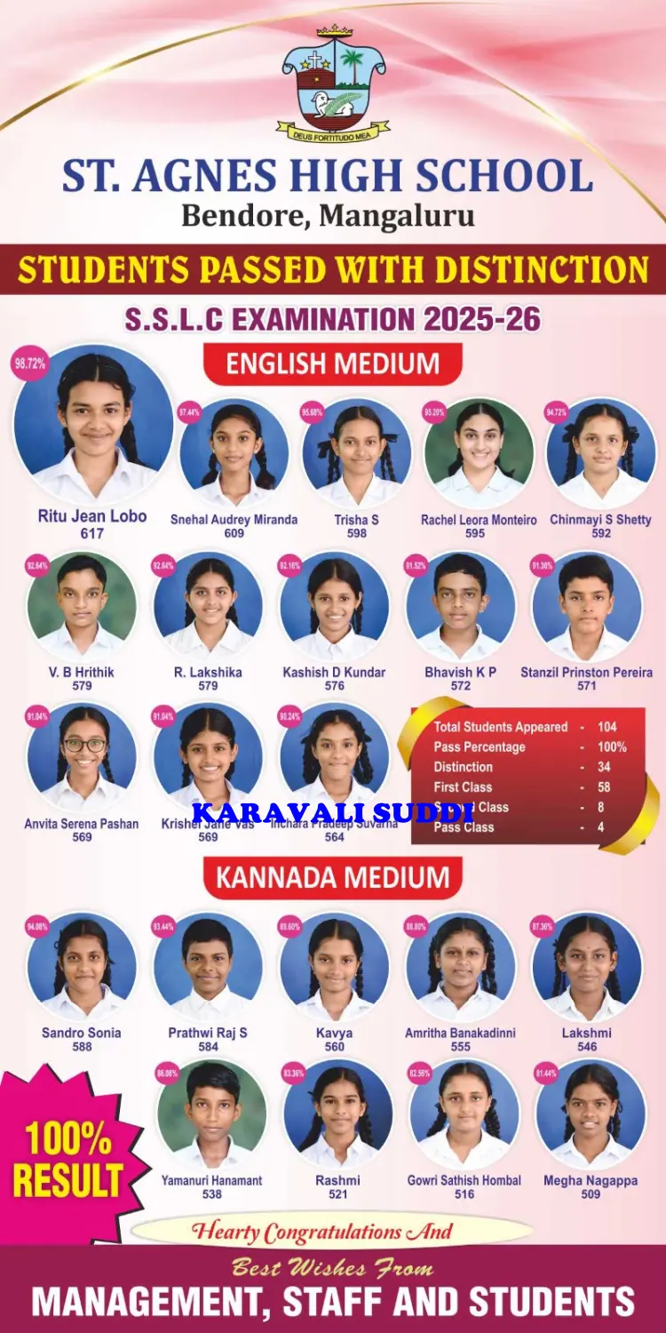 ಮಂಗಳೂರು ನಗರದ ಪ್ರತಿಷ್ಠಿತ ಸೈಂಟ್ ಆಗ್ನೆಸ್ ಪ್ರೌಢಶಾಲೆಯು ಈ ಬಾರಿಯ SSLC ಅಂತಿಮ ಪರೀಕ್ಷೆಯಲ್ಲಿ ಶೇಕಡಾ 100ರಷ್ಟು ಅದ್ಭುತ ಫಲಿತಾಂಶವನ್ನು ದಾಖಲಿಸುವ ಮೂಲಕ ಶೈಕ್ಷಣಿಕ ಕ್ಷೇತ್ರದಲ್ಲಿ ತನ್ನ ವಿಜಯಯಾತ್ರೆಯನ್ನು ಮುಂದುವರಿಸಿದೆ.