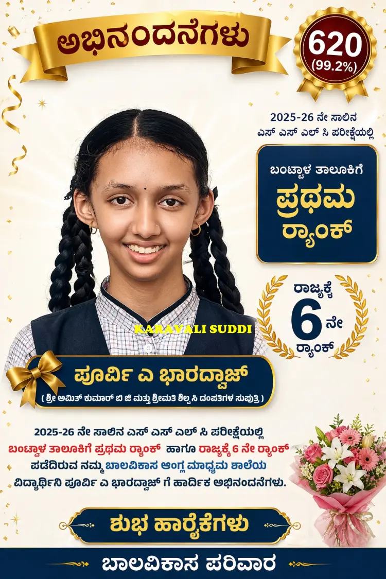 ಶೈಕ್ಷಣಿಕ ಕ್ಷೇತ್ರದಲ್ಲಿ ಸದಾ ಮುಂಚೂಣಿಯಲ್ಲಿರುವ ಮಾಣಿ ಬಾಲವಿಕಾಸ ಆಂಗ್ಲ ಮಾಧ್ಯಮ ಶಾಲೆಯ ವಿದ್ಯಾರ್ಥಿನಿ ಪೂರ್ವಿ ಎ. ಭಾರದ್ವಾಜ್, 2025-26ನೇ ಸಾಲಿನ SSLC ಪರೀಕ್ಷೆಯಲ್ಲಿ ಅತ್ಯುತ್ತಮ ಸಾಧನೆ ಮಾಡುವ ಮೂಲಕ ತಾಲೂಕಿಗೆ ಹೆಮ್ಮೆ ತಂದಿದ್ದಾರೆ.