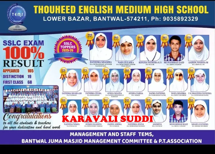 ಇತ್ತೀಚೆಗೆ ಪ್ರಕಟಗೊಂಡ ರಾಜ್ಯ ಮಟ್ಟದ SSLC ಪರೀಕ್ಷಾ ಫಲಿತಾಂಶದಲ್ಲಿ ಬಂಟ್ವಾಳದ ತೌಹೀದ್ ಇಂಗ್ಲಿಷ್ ಮಾಧ್ಯಮ ಪ್ರೌಢಶಾಲೆಯ ವಿದ್ಯಾರ್ಥಿನಿ ಆಭಿದುನ್ನೀಸ ಎಂ. ಅವರು ಅತ್ಯುತ್ತಮ ಅಂಕಗಳನ್ನು ಗಳಿಸುವ ಮೂಲಕ ಶಾಲೆಗೆ ಮತ್ತು ಪೋಷಕರಿಗೆ ಹೆಮ್ಮೆ ತಂದಿದ್ದಾರೆ.